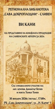 В РЕГИОНАЛНА БИБЛИОТЕКА „САВА ДОБРОПЛОДНИ” – СЛИВЕН ЩЕ БЪДЕ ПРЕДСТАВЕНА КНИЖНАТА ПРОДУКЦИЯ НА СЛИВЕНСКИТЕ АВТОРИ ЗА 2025 ГОДИНА